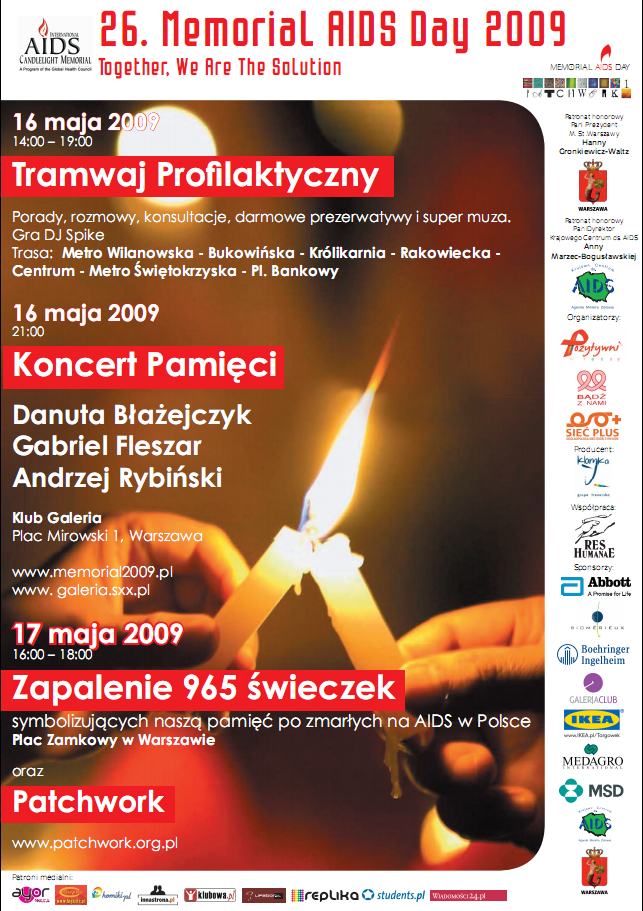W 1700 miastach w 93 krajach świata po raz 26. obchodzony będzie Memorial AIDS Day. Co roku, w każdą trzecią niedzielę maja, na całym świecie organizowane są wydarzenia dla upamiętnienia wszystkich osób, które zmarły z powodu AIDS. Ten dzień i realizowane w ramach naszego projektu wydarzenia stanowią okazję do zademonstrowania wsparcia dla osób żyjących z HIV i chorych na AIDS. Mimo, że w różnych krajach dzień ten wygląda inaczej, jedno jest wspólne: wszędzie płonie światło świec i lampek oliwnych, zapalonych z myślą o tych, którzy stracili życie z powodu AIDS.
