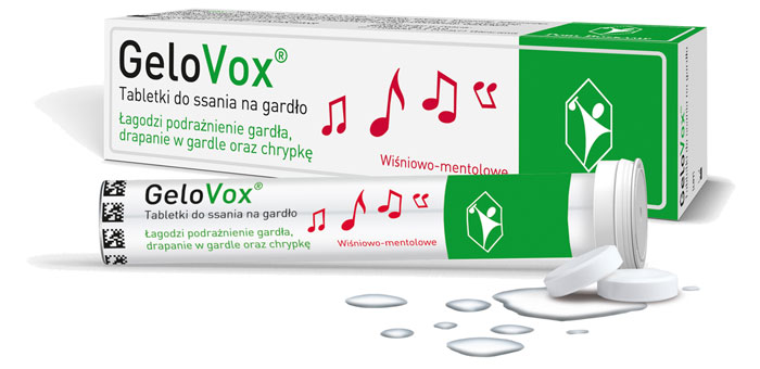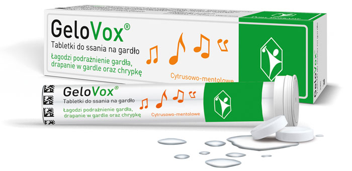 GeloVox to tabletki do ssania długotrwale nawilżające błonę śluzową jamy ustnej i gardła. Preparat podczas ssania wytwarza oryginalny kompleks hydrożelowy zawierający kwas hialuronowy, który intensywnie nawilża i ochrania podrażnioną błonę śluzową jamy ustnej i gardła, sprzyjając jej regeneracji. Polecany jest do stosowania przy chrypce oraz wspomagająco w czynnościowych zaburzeniach głosu spowodowanych m.in: wysiłkiem głosowym, infekcjami nosa i gardła, stosowaniem leków wziewnych, zanieczyszczeniem powietrza, paleniem papierosów. GeloVox jest odpowiedni dla dzieci od 6. roku życia, może być stosowany przez diabetyków oraz osoby z nietolerancją laktozy i glutenu.